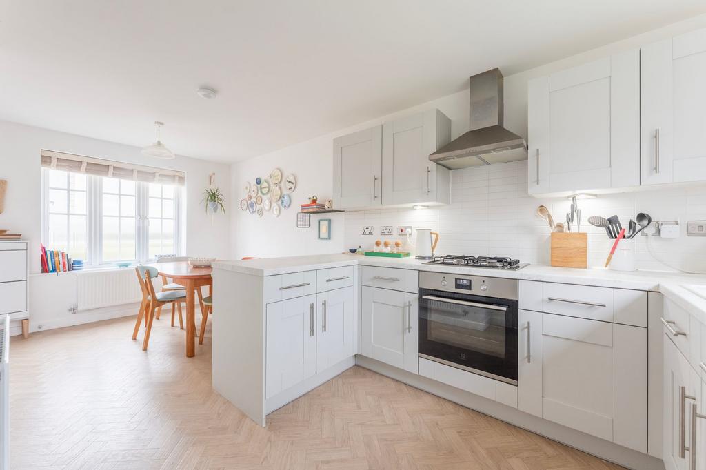 For those who love morning country walks and the quiet charm of village life, this modern three-bedroom detached home offers the perfect mixture of features and comfort. Built in 2023, it boasts excellent thermal efficiency and a 7-year NHBC warranty for peace of mind. Minimalistic, turnkey interiors feature bright, airy rooms and premium Amtico LVT herringbone flooring throughout the ground floor. The spacious lounge is bathed in natural light, with French doors opening onto a newly landscaped garden. A contemporary open-plan kitchen/diner comes complete with integrated appliances and generous space for family meals or entertaining. Adjacent utility and downstairs WC add practical functionality to everyday living. Upstairs, the master bedroom includes built-in wardrobes and a private en-suite, complemented by two further well-proportioned bedrooms and a modern family bathroom. Externally, off-road parking for two leads to a single garage, half of which has been converted into a versatile office space. The rear garden is enclosed, mostly lawned, and enhanced by seven pleached trees providing privacy and greenery. With sleek finishes, thoughtful storage, and a light-filled layout, this home effortlessly combines contemporary comfort with effortless living.