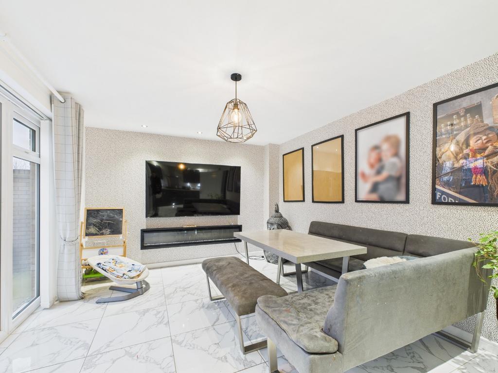 Smartly presented throughout, the home features a thoughtfully designed layout ideal for modern family life. The welcoming entrance hall leads to a spacious main lounge, a versatile second reception room perfect as a playroom or study, and an impressive open-plan living/dining kitchen with sleek modern units and integrated appliances. French doors open onto the rear garden, seamlessly blending indoor and outdoor living. A separate utility room and a guest WC complete the ground floor.