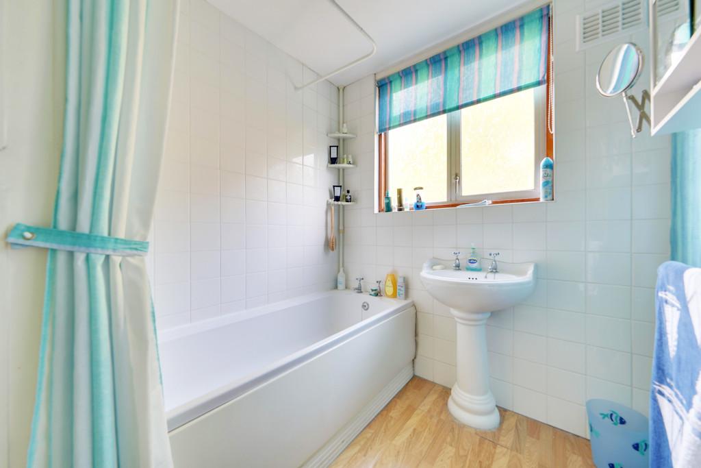 BATHROOM Wash hand basin, bath, double glazed opaque window to rear, wood effect flooring, heated towel rail.