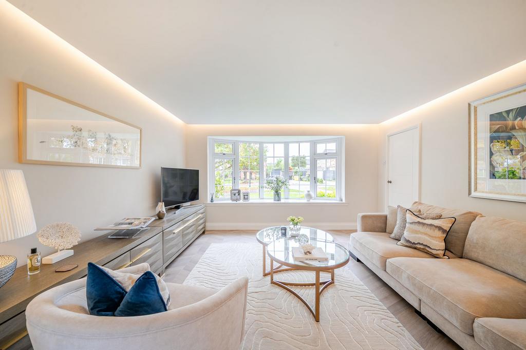 Inside, the entrance hall leads to a bright bay-fronted reception room and a ground-floor shower room. Glazed pocket doors open into the dining area, which flows through to a bespoke hand-painted oak kitchen fitted with Siemens appliances and a Quooker boiling-water tap. The generous utility room provides further storage and direct access to the garage and garden.