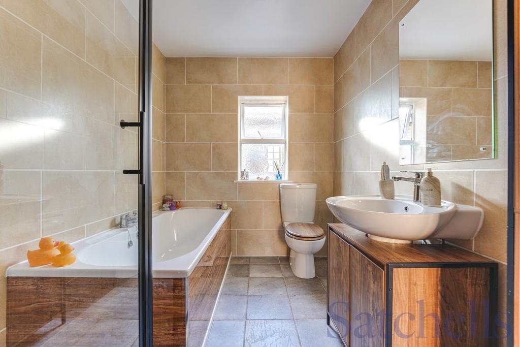 A modern Four piece suite comprising a low level WC, wash hand basin, over-sized bath with central taps and a single shower cubicle. Fully tiled walls and flooring. Double glazed widow to side aspect. Ceiling light. Radiator.