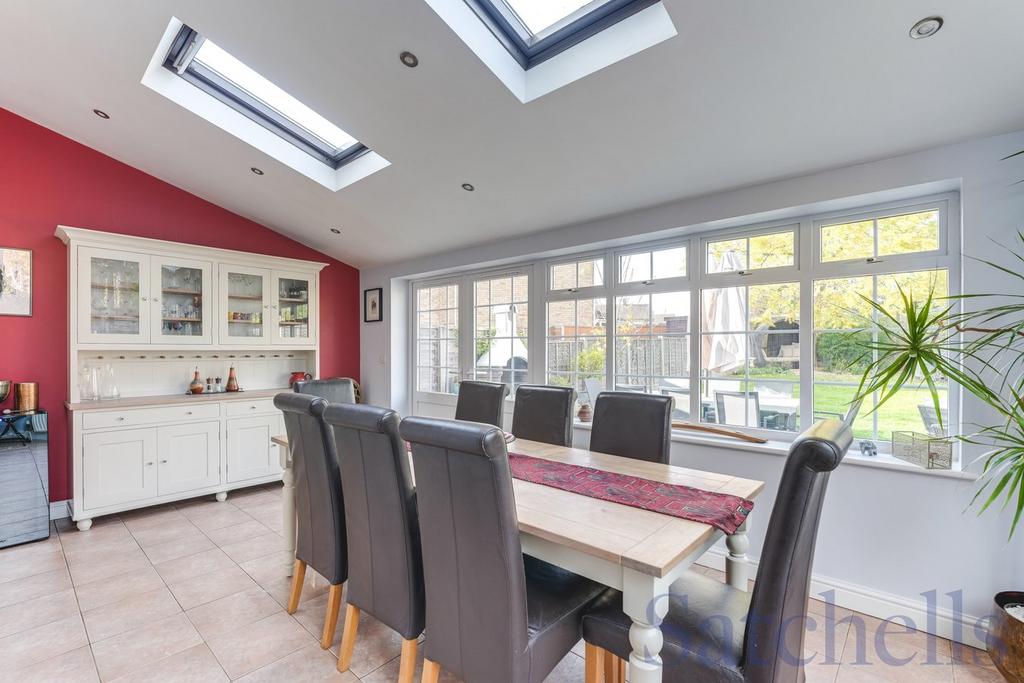 Abt. 17' 8" x 10' 0" (5.38m x 3.05m) The dining area can comfortably fit a table seating 12-14 people. This is a bright and airy room with Two velux windows, feature windows to the side aspect and further windows and double glazed patio doors overlooking the rear garden. Tiled flooring. Spotlights. Radiator. Internal glazed doors opening into:
