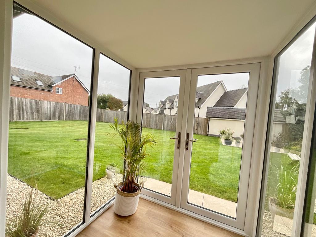 Adjoining the kitchen is a bright sun room, with windows on all sides allowing plenty of natural light to pour in. This tranquil space offers a pleasant view over the garden, with double French doors that open directly out to the rear patio — ideal for easy indoor-outdoor living.