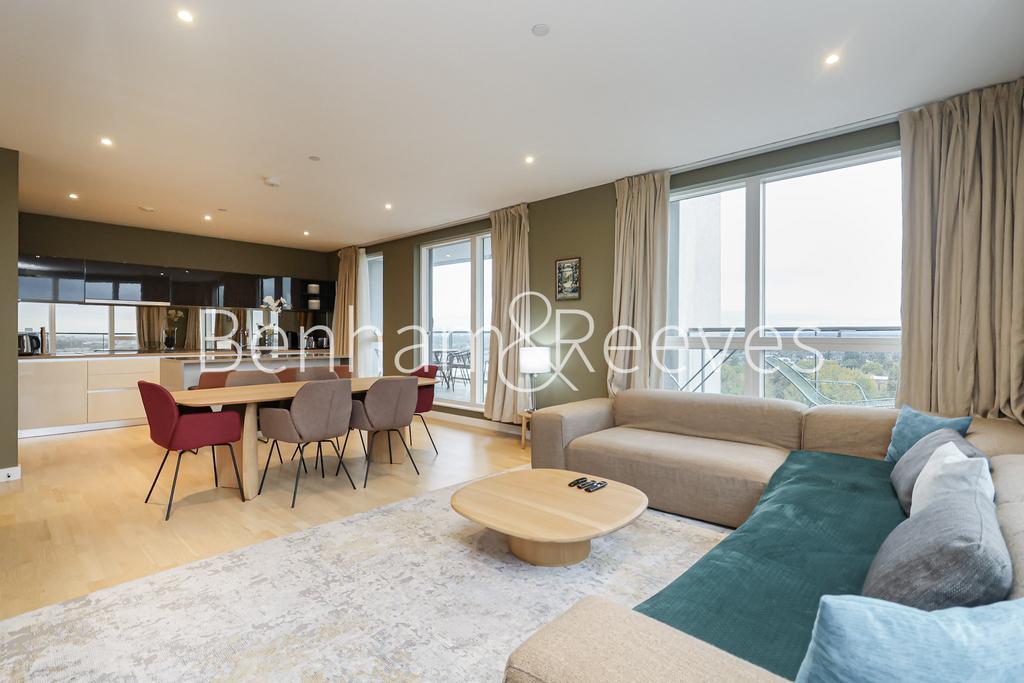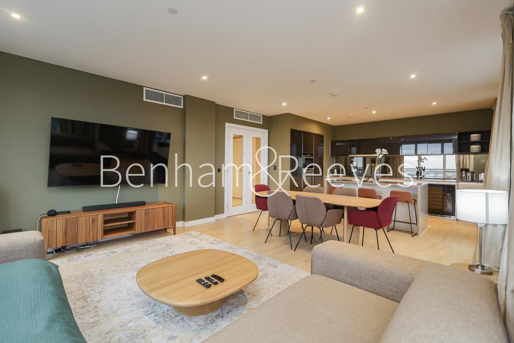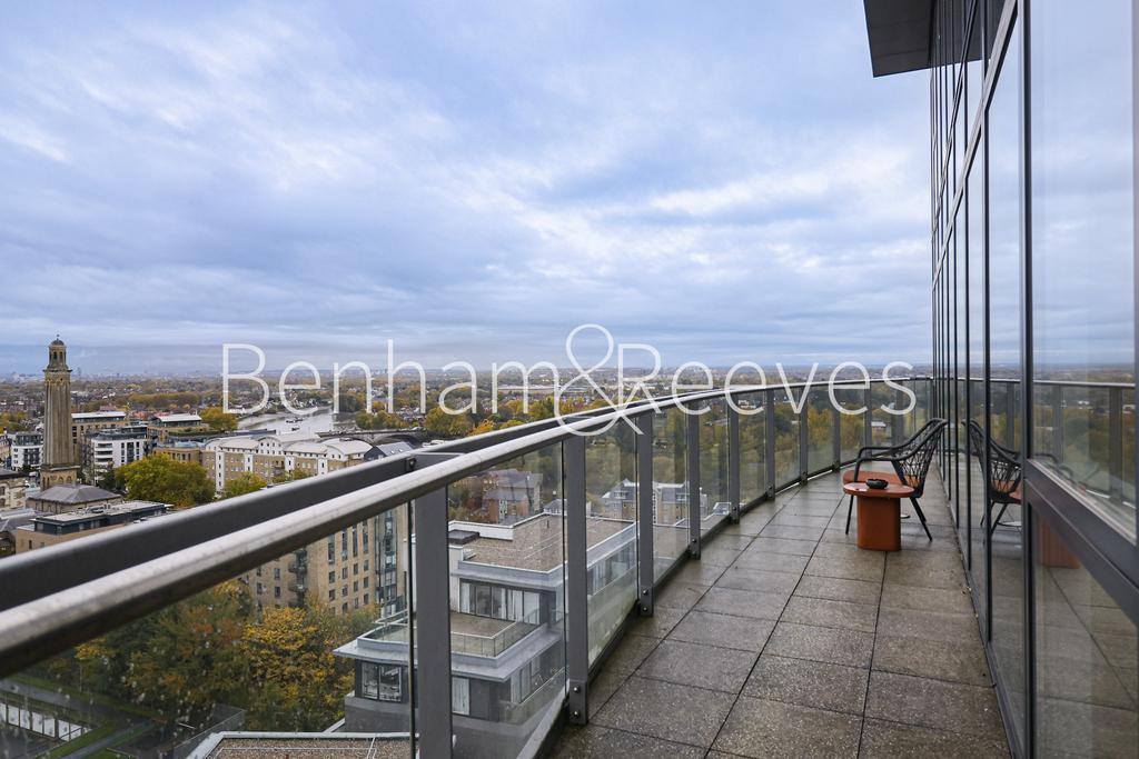 The generously proportioned living area spans comprises a spacious reception with wood flooring, plenty of space for dining/ entertaining, floor-to-ceiling windows leading out to a large private terrace affording delightful River views, and a fully fitted modern kitchen with integrated appliances. There are three double bedrooms with good storage space, en-suite to the principal bedroom, a second bedroom, and a sleekly designed family bathroom. The apartment is offered on a furnished basis.