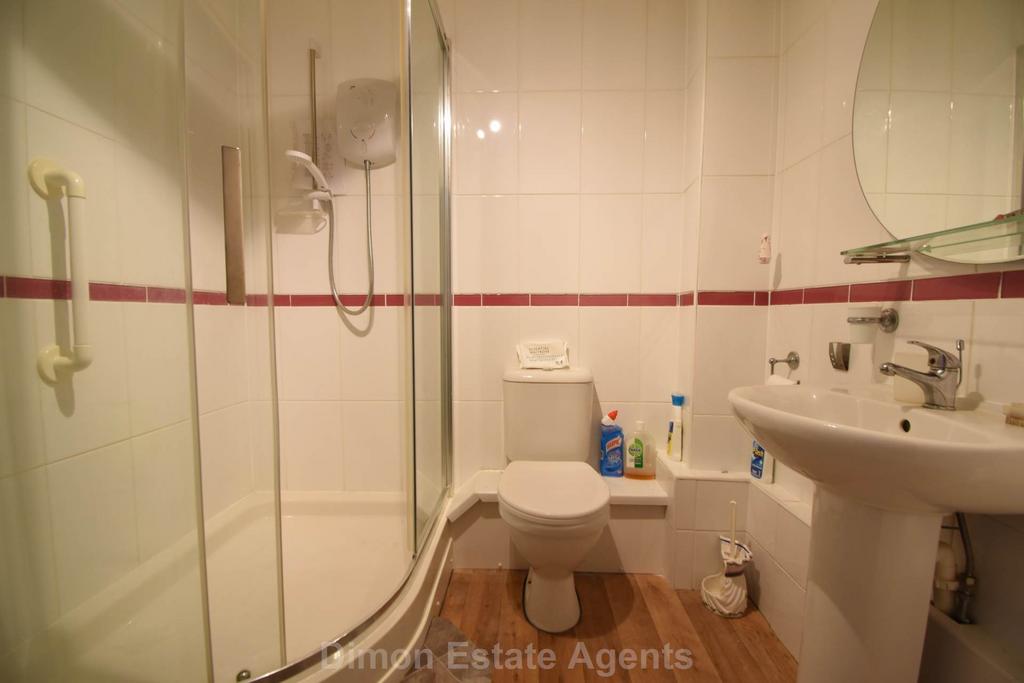 Shower cubicle with Mira shower, pedestal hand basin, low level W.C., emergency assistance pull cord, tiled walls, mirror, extractor fan.