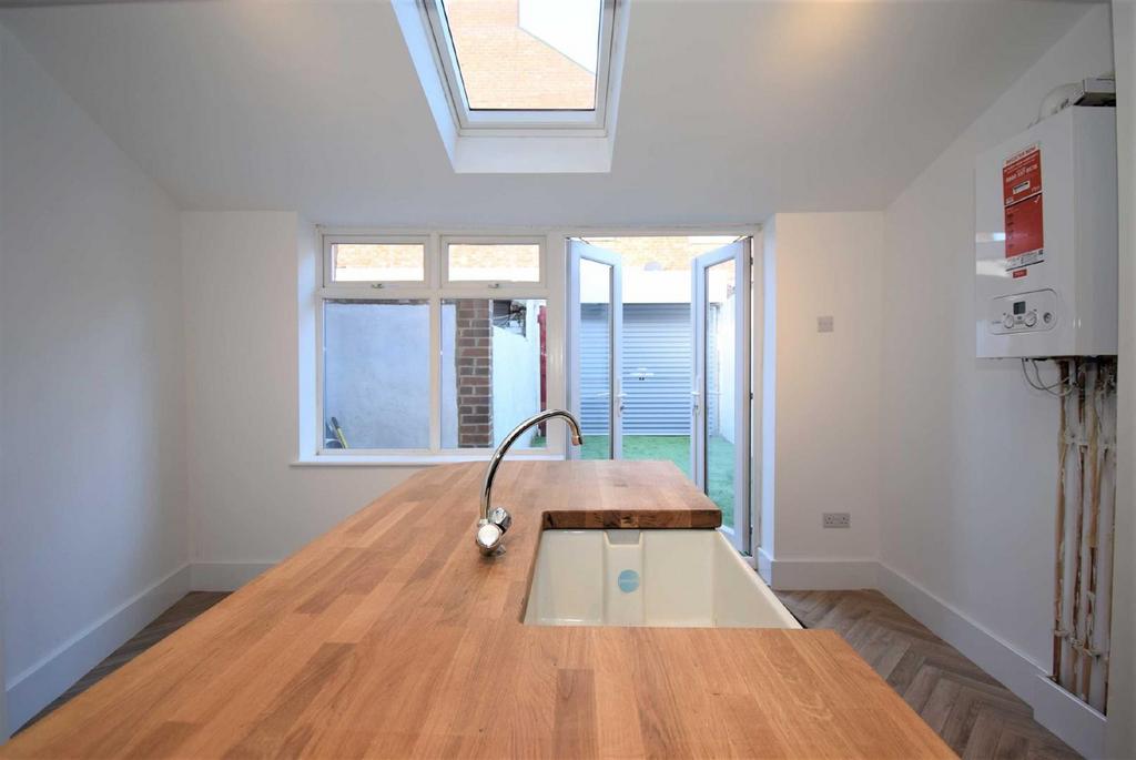 Kitchen Diner - 6.20 x 3.75 max - An extended room with French doors to the rear and velux sky light. There's a Wren fitted kitchen comprising wall, base units and hardwood work surfaces. A central breakfast Island has a Belfast style sink and concealed spaces for a washer and dishwasher. Housed is an Induction hob with filter hood over and an electric oven, space for a fridge freezer. Built in pantry cupboards, spot lights and a radiator