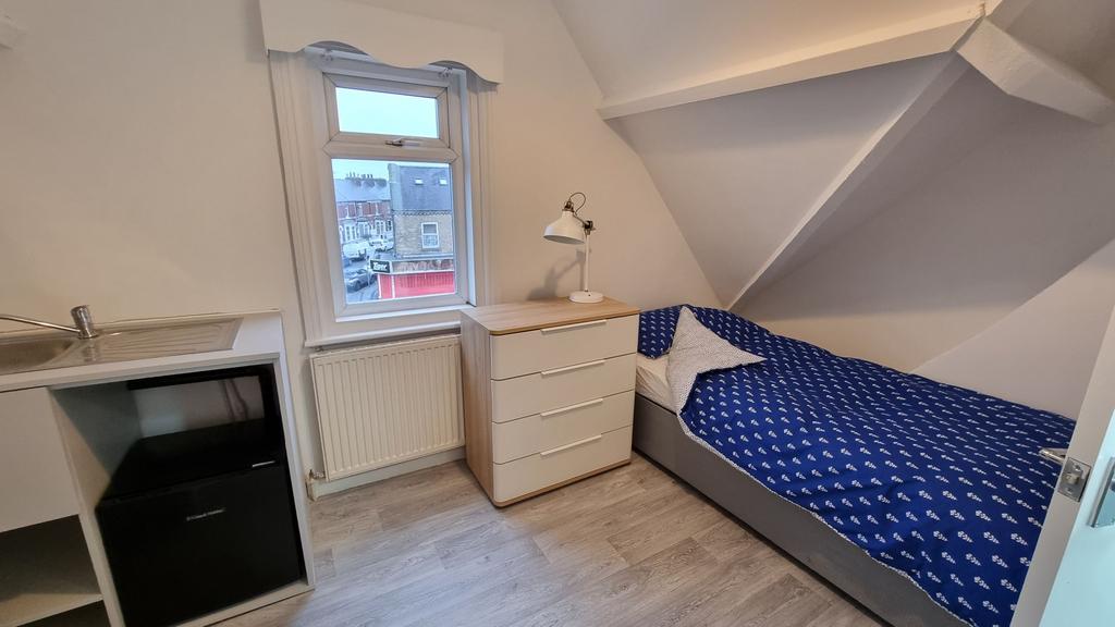 Furnished double bedroom with sloping dorma double glazed window, tea making area with sink and personal fridge, modern ensuite shower room all decorated in neutral grey with grey oak effect laminate flooring and radiator.