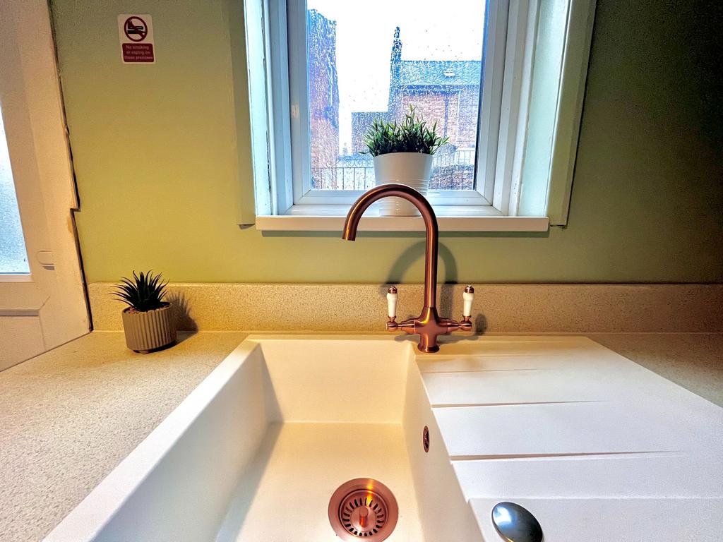 Entrance to hallway into the spacious comfortable lounge area with dining table, through to modern grey kitchen with ample wall and floor units for all residents, oven, fridge/freezer and microwave all with neutral grey flooring throughout. Double glazed door gives access into the communal rear yard.