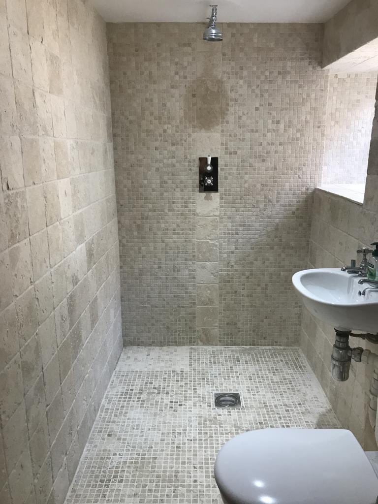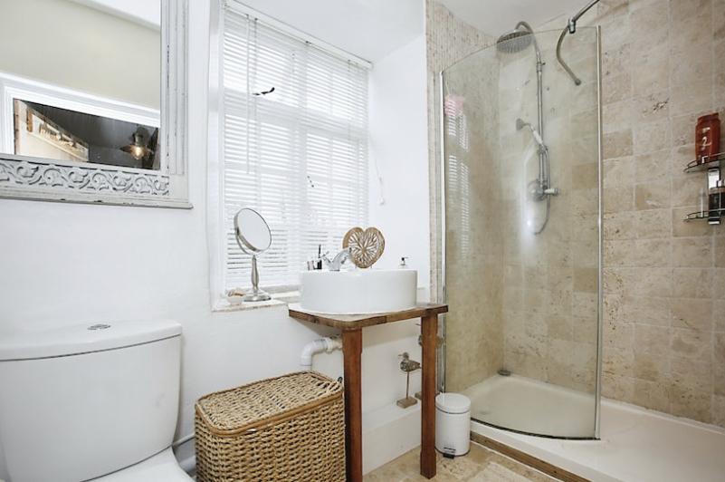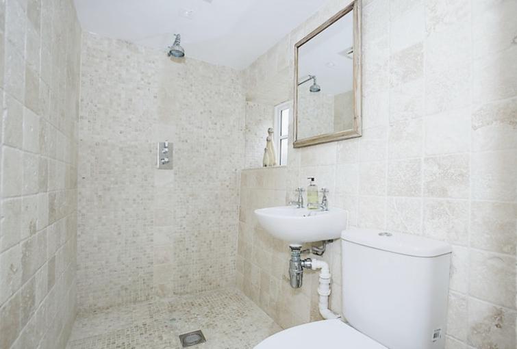 Main Bathroom: 2m x 4 m with walk -in shower, large sink on wooden base and WC