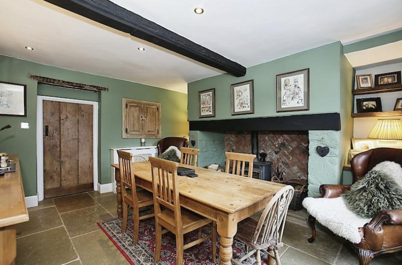 Dining Room: 4.4m x 4.3m; Fireplace with Bessemer beam over, paved hearth and multi fuel stove, window seat and shutter on windows, original cupboard, exposed beams, stone floor and door to the…