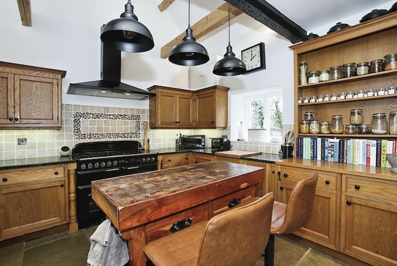 Kitchen / Sitting Area: 7.2m x 3.7m: Range Cooker, Belfast Sink, Oak fitted Cupboards, Dresser and Plate Rack, Granite Tops, Exposed Beams and Vaulted Ceiling with high window. Worcester Boiler and Water heater (1 year old) and under floor Heating and Radiator. Stone Floor.