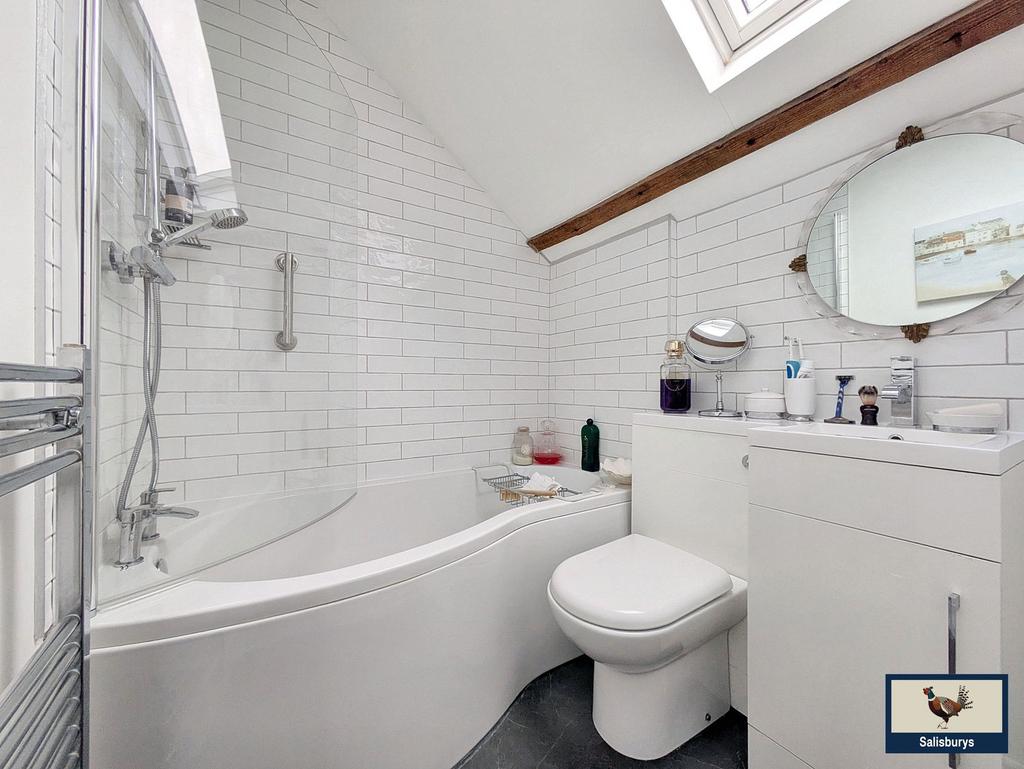 Bathroom: (1.77m x 1.71m/5'10" x 5'7") The Bathroom is fitted with a "P" bath with thermostatically controlled wall shower, fully tiled shower surround, fixed shower door, slate effect flooring, combination handbasin and w.c vanity unit and a skylight window.