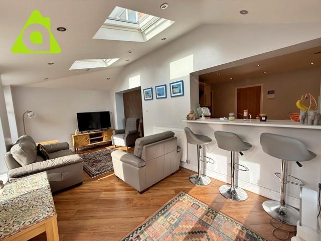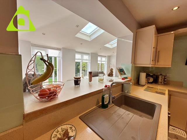A bright and spacious additional reception room enjoying fantastic views of the rear garden. Two Velux windows with a fully insulated tiled roof, wooden flooring, spotlights, and French doors to the rear elevation.