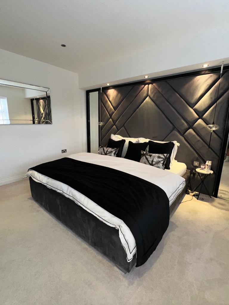 Primary bedroom equipped with a stunning floor to ceiling headboard and hidden door leading into en-suite bathroom