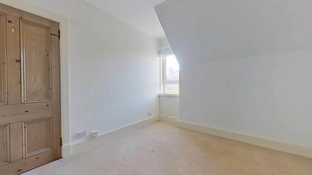 To the front of the house this spacious double bedroom has double windows looking to Tulloch Park. A stripped pine door opens into a deep cupboard with hanging rail and shelves which also houses the gas boiler and the electricity consumer unit. A lovely cast iron fireplace with wooden surround provides a focal point.