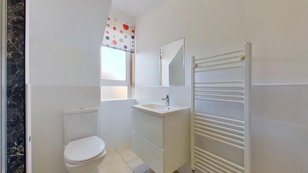 Containing a 2-piece white suite comprising wall mounted basin inset to a drawer unit and WC. A separate large shower houses a mains shower with wet wall surround. Inset to an alcove is a double set of shelved cupboards. The floor is tiled as are the walls, to half height.