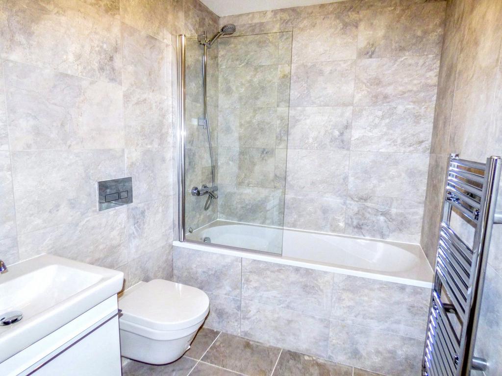 A modern three piece suite comprising: wall mounted wash hand basin, bath with shower over and shower screen, low level WC. The wall tiling is tasteful and complement the suite nicely. Heated towel rail.