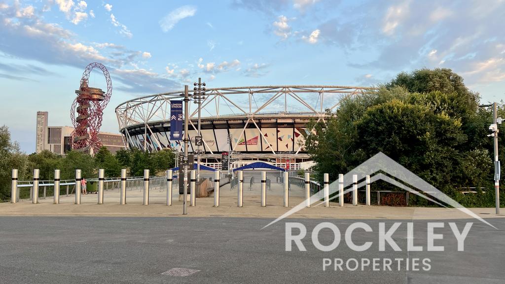 A large balcony looking towards the Bow Back River and views of the Queen Elizabeth Olympic Park.