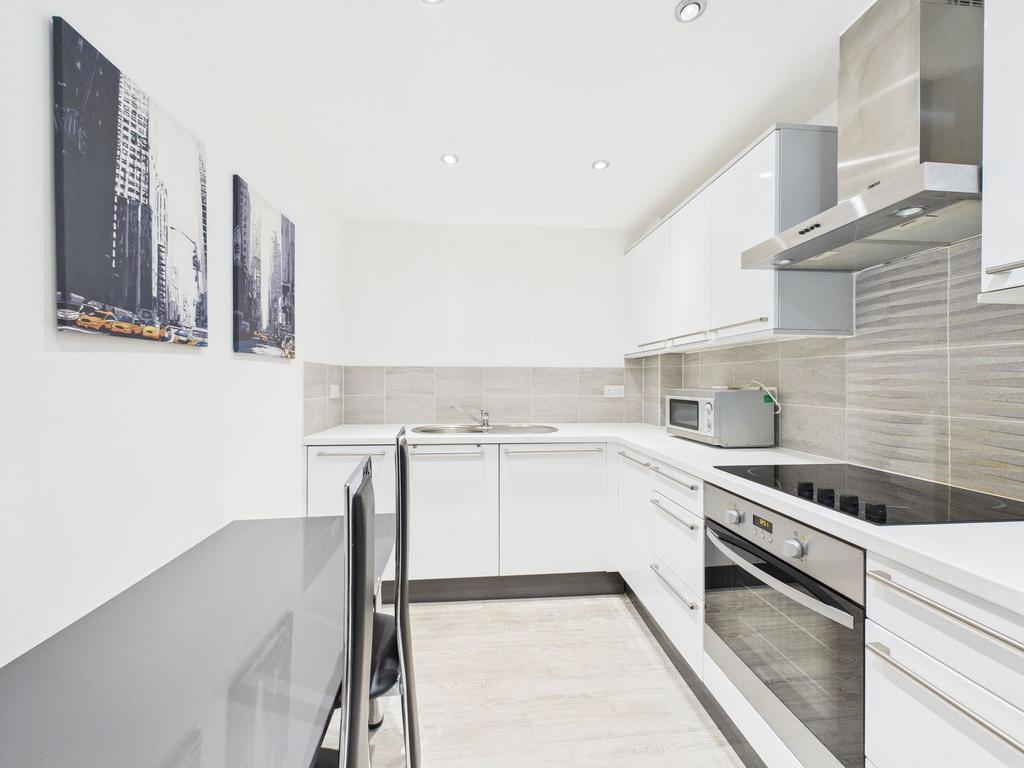 The kitchen area has a white high gloss fitted kitchen with units to wall and floor, work surfaces over. Feature display shelving, integral appliances include a single stainless steel oven/grill, ceramic hob with extractor fan over, washer/dryer, full size dishwasher, fridge and freezer. Stainless steel sinks and drainer. Wall mounted combination boiler. Grey tile splashbacks. Wall mounted Potterton combination boiler. There is space for a dining table and chairs along with space for living room furniture. TV and telephone point. Chrome spotlights. Amtico flooring.