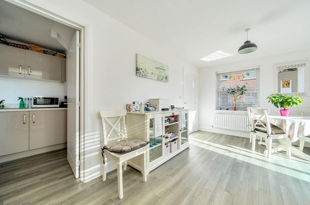 The ground floor features a welcoming sitting room with a large bay window allowing for plenty of natural light, leading through to a generous kitchen/dining room with double doors opening to the rear garden. A utility room and ground floor cloakroom complete the downstairs accommodation.