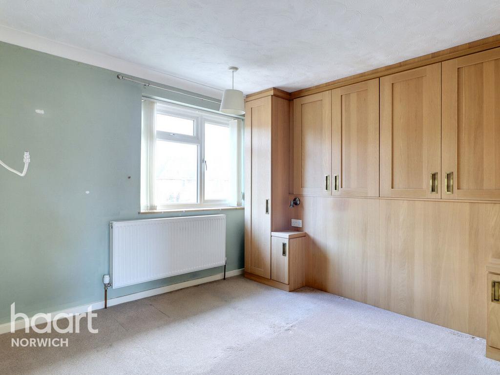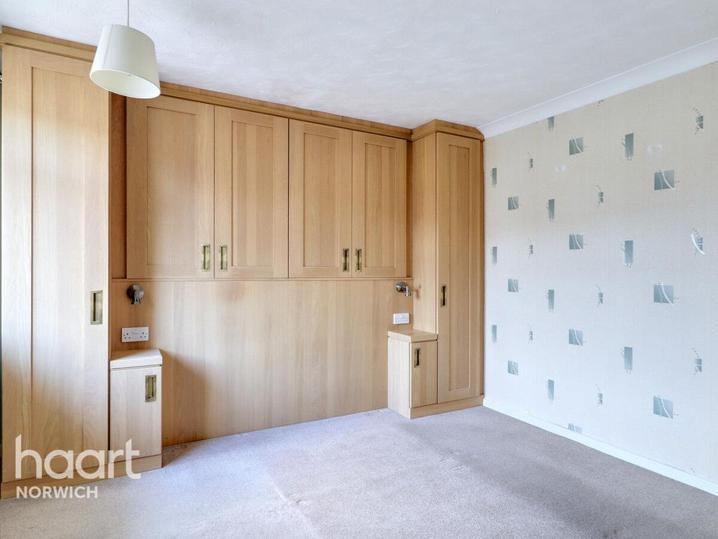 Modern built in double wardrobe with side drawers, UPVC window to rear, radiator, coved an textured ceiling, carpet flooring