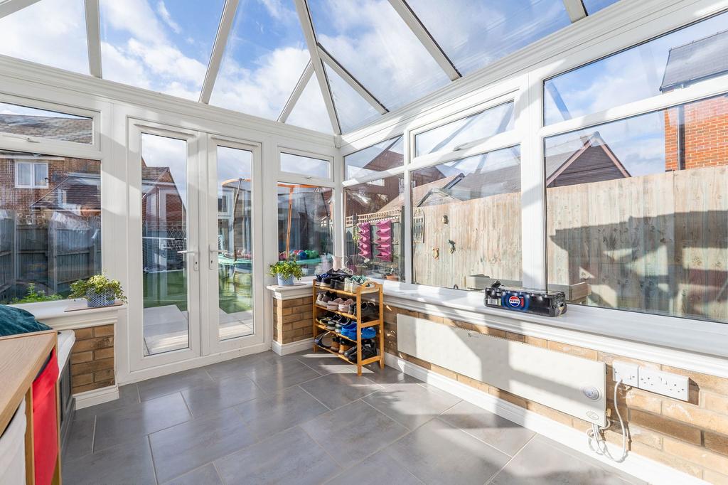 The entrance hall leads to a cloakroom WC and a well-appointed kitchen/breakfast room, complete with ample storage and workspace — ideal for family life or casual dining. To the rear of the home, the spacious lounge/diner offers a versatile area for relaxation and entertaining, featuring double doors that open into a bright conservatory. This additional space is perfect for enjoying views of the garden all year round.