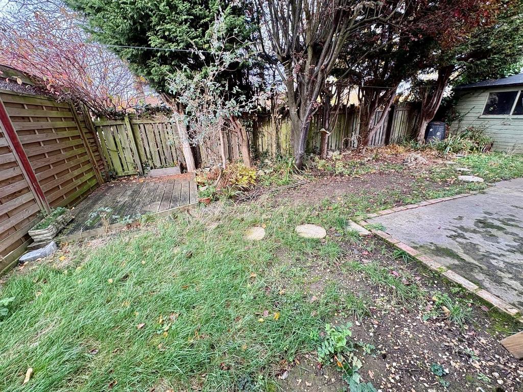 Patio seating area, mainly laid to lawn, gated side access to front, wooden garden shed and enclosed by wooden panelled fence.