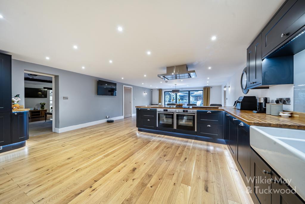 This beautifully presented five-bedroom farmhouse is set within land approaching three quarters of an acre, benefitting from three substantial garages, with private electric gated access and imposing games room with a Scandinavian herringbone roof over 45’ in length with a bar area, cloakroom and a store.