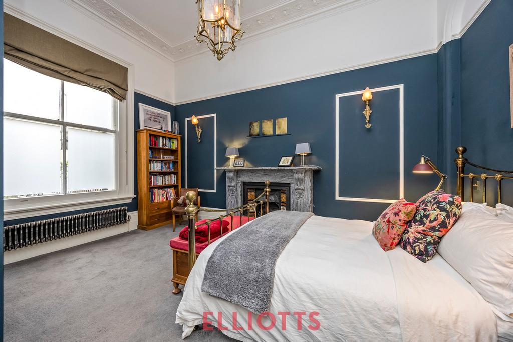 The principal bedroom is a generous double overlooking the rear garden. Elegantly styled with extensive built-in wardrobes and another feature marble fireplace, it offers a refined and restful retreat. The second double bedroom also enjoys garden views and opens directly onto the private west-facing garden—an idyllic space for morning coffee, al fresco dining, or simply soaking up the afternoon sun.