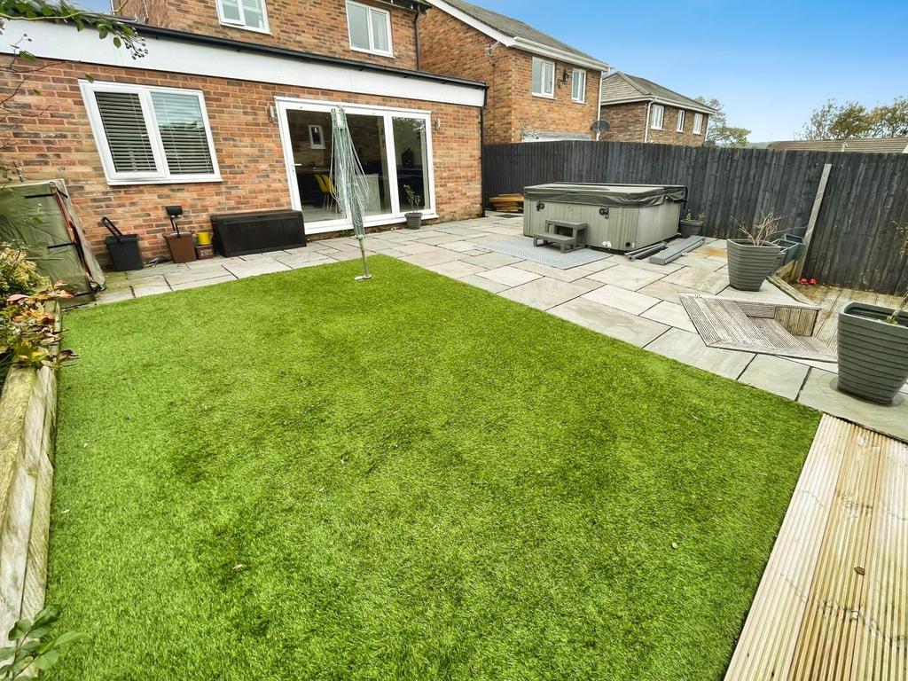 Good sized enclosed low maintenance rear garden laid to grey Indian sandstone, artificial grass and steps down to a wood decked area. Space for good sized freestanding shed. Outside tap and double socket.