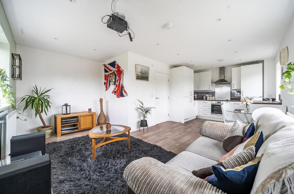 This spacious and smartly-presented flat is on the top (second) floor of a recently-constructed development and offers a very pleasant view of the surrounding countryside. The property has a twenty-one-foot, dual-aspect reception room with open-plan kitchen area featuring sleek, white units, a contrasting worktop and integrated appliances. There is a generously-sized bedroom and a simple, modern bathroom. A large storage/utility cupboard has been provided in the entrance hallway and well insulated walls and roof, high performance glazing and a communal heating/hot water system all contribute towards a very good energy-efficiency rating. The property is held on a very long lease and comes with use of an allocated parking space. The city centre can also be reached on foot, via bus or by brief cycle ride.