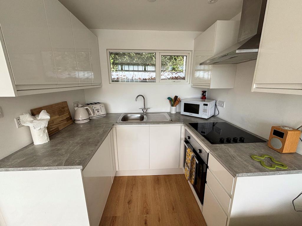 Upvc window to rear, contemporary base units, stainless steel sink and drainer, built in oven and ceramic hob, integral fridge, laminate work-top.