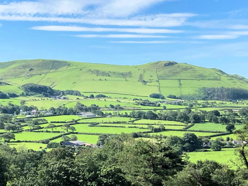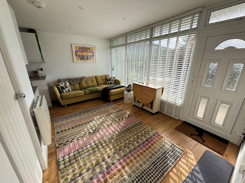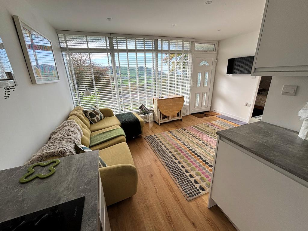 Upvc door and picture window to front with hillside views over the valley, laminate floor, wall mounted heater.