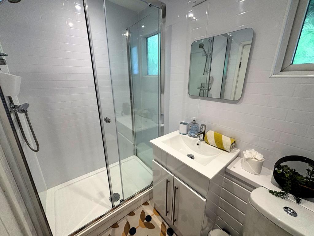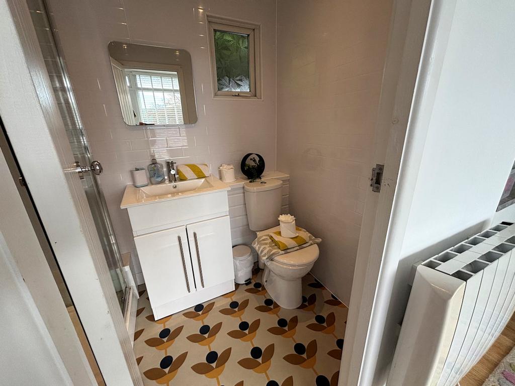 2 upvc windows to rear, panelled walls, vinyl floor, vanity wash basin, w c, shower cubicle.