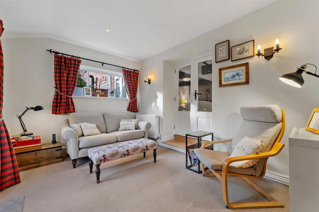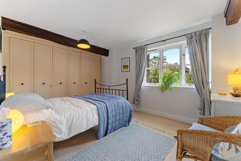 On the ground floor is a central entrance hall with large understairs cupboard and cloakroom WC. There is an impressive living room with large, exposed brick fireplace with log burning stove, original beams and French doors opening to the garden. The bright breakfast kitchen has shaker style units, wooden worksurfaces with Belfast sink and large Rangemaster stove, there is a built-in breakfast seat and four Velux windows flooding the room with natural light.