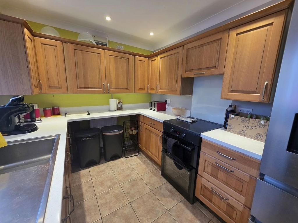 Kitchen 10'6 x 7'10 (3.2m x 2.39m): Window to front elevation, tiled flooring, eye and base level units with worktops over, inset stainless steel sink and drainer, space and plumbing for appliances, and space for cooker and fridge/freezer.