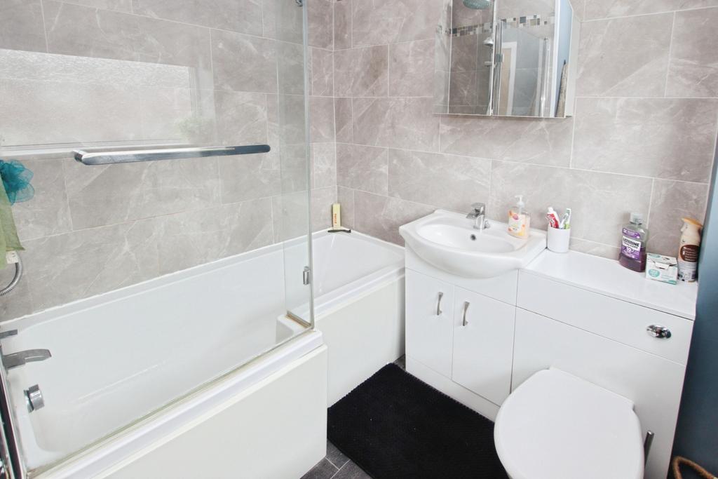 The modern family bathroom features a three-piece suite comprising a P-shaped bath with rainfall shower, vanity wash basin, low-level WC, vinyl flooring, tiled surround, radiator, and obscured uPVC window to the rear.