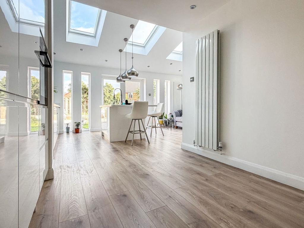 As you step inside, a welcoming hallway leads to a spacious through lounge, a warm and inviting room designed for relaxing with family or entertaining friends. Beyond this, the heart of the home awaits — a stunning open-plan kitchen, dining and family area that truly defines contemporary living. Electric Velux windows fill the room with natural light, while large patio doors open directly onto the rear garden, creating a seamless flow between indoor and outdoor spaces. The sleek modern kitchen includes integrated appliances, generous work surfaces and a central island, making it the perfect place to gather, cook and socialise.