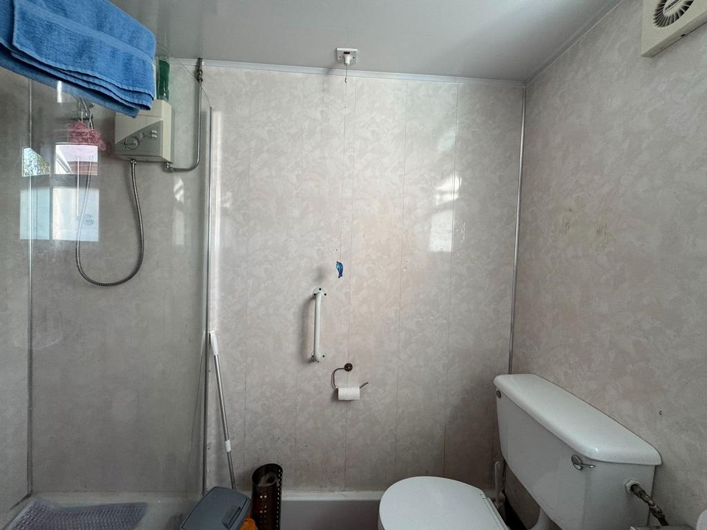 Window to side. Fitted shower cubicle. WC. Hand wash basin.