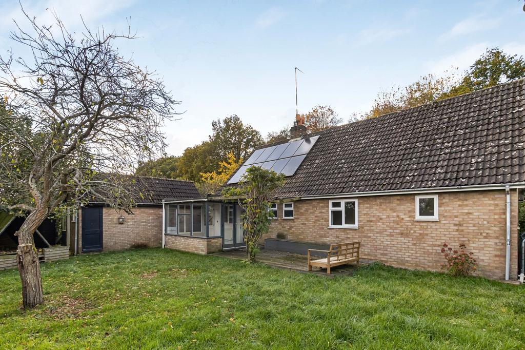 A three/four bedroom detached bungalow with sitting room with open fireplace, kitchen, dining room/conservatory, study/bedroom four and a family bathroom, together with a detached single garage, workshop, outside wc and store, gardens and off road parking for three vehicles. All nestled in a quiet rural area with Stack Wood to the front, and open farmland to the rear, nearby the popular village of Polstead.