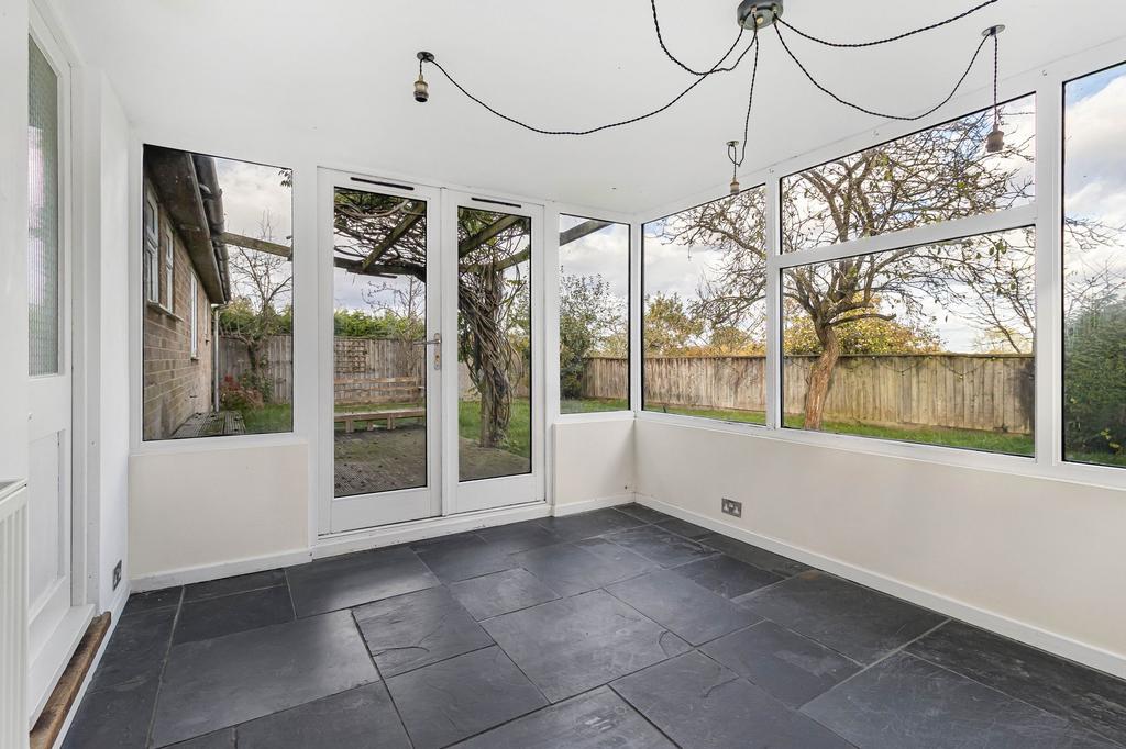 As you enter the property, there is a hallway with a large storage cupboard and doors to the bedrooms, bathroom, kitchen, dining room and sitting room, which has dual aspect windows to the front and side, serving hatch though to the kitchen and a brick fireplace with brick shelving to the side. The kitchen has a window to the side, window looking into the dining room/conservatory and comprises a sink unit inset into a range of work surfaces with cupboards and drawers below, matching high level storage cupboards, built-in storage cupboard, oven with a four burner hob and extractor above and a door to the dining room/conservatory, which has triple aspect windows overlooking the garden, French doors overlooking and leading leading out to the same and a door leading out to the side.