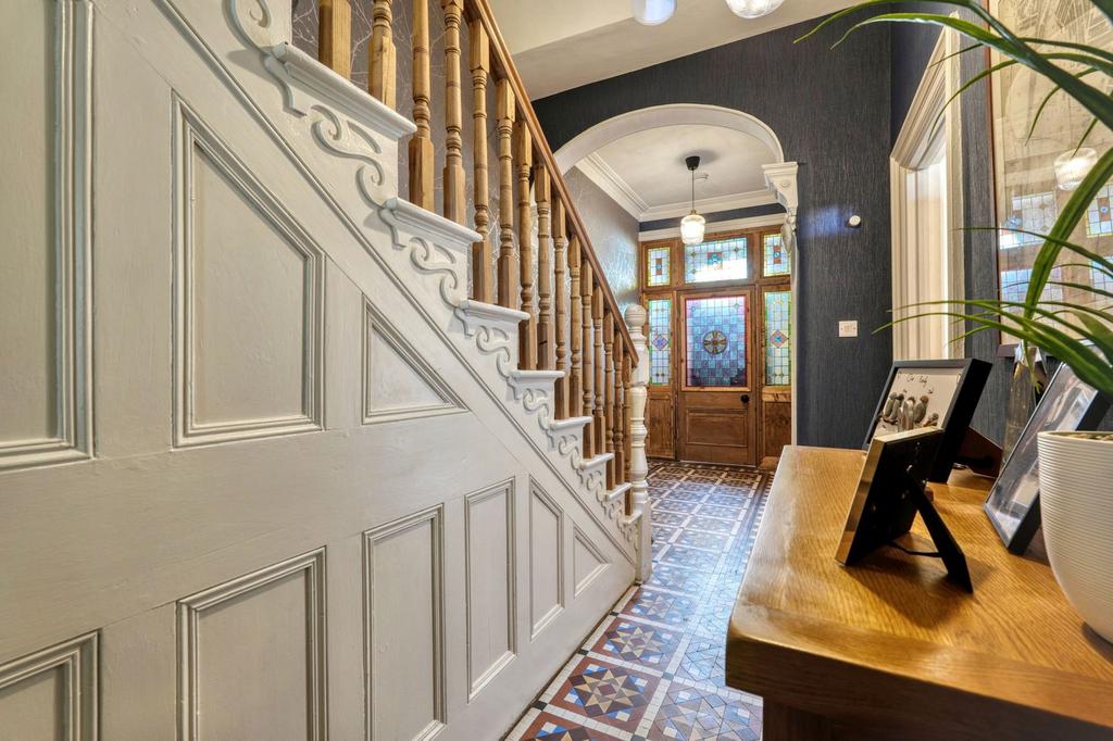 From the moment you arrive, the details draw you in – the neat lawned front garden, the porch with its restored and repaired stained-glass and the tiled hallway that still has its beautiful original flooring fully intact.