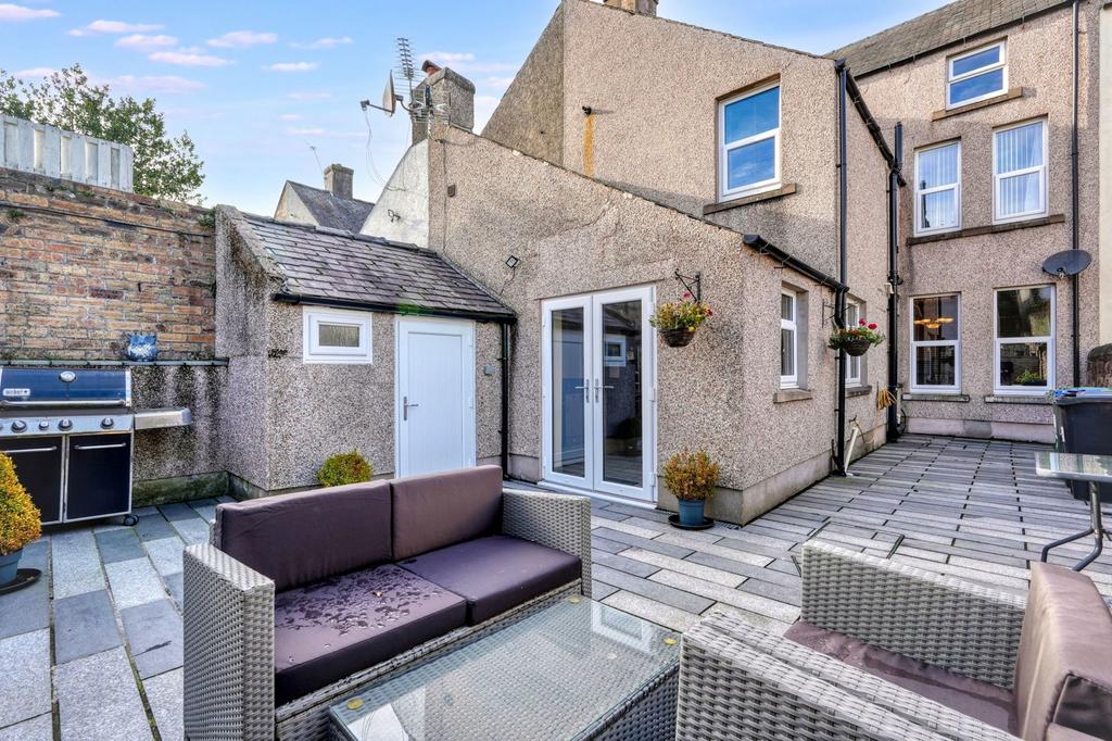 Outside, the tiered back garden has been landscaped with low maintenance enjoyment in mind. There’s a paved patio nearest the house, three smart artificial lawn sections, steps leading up to a raised seating area.