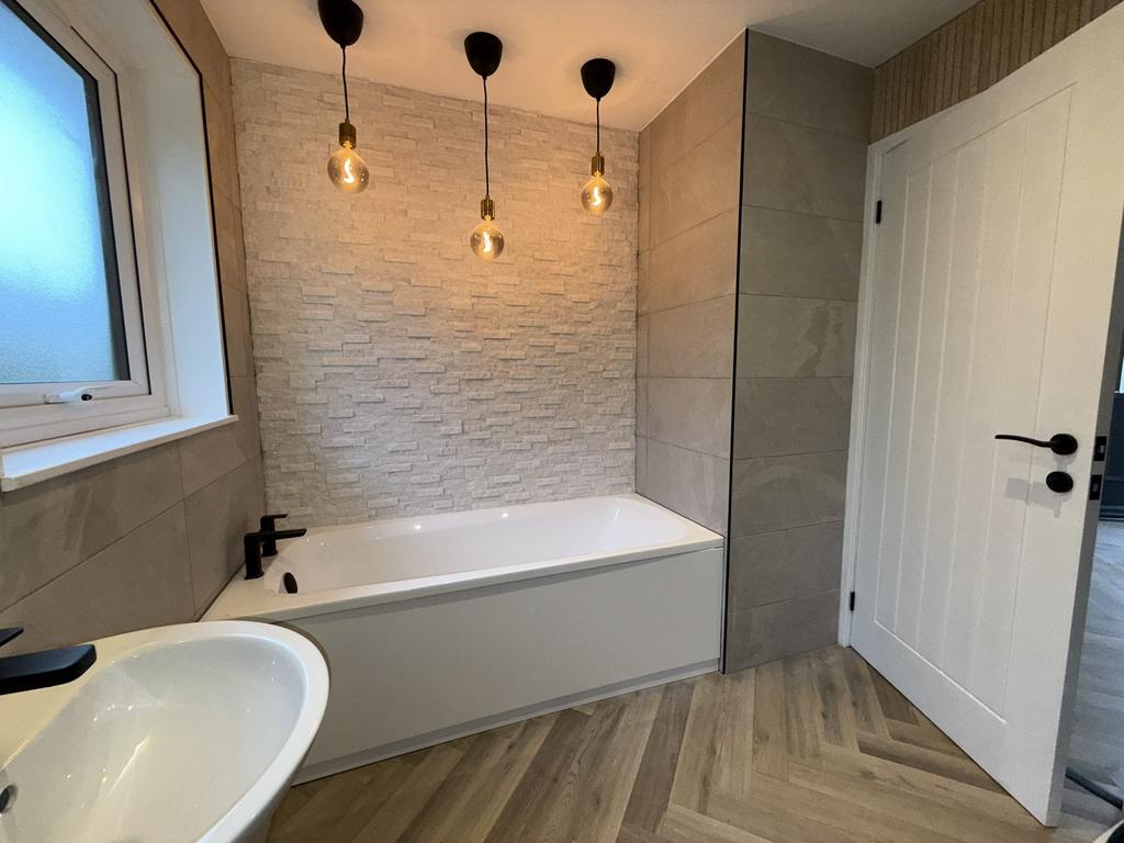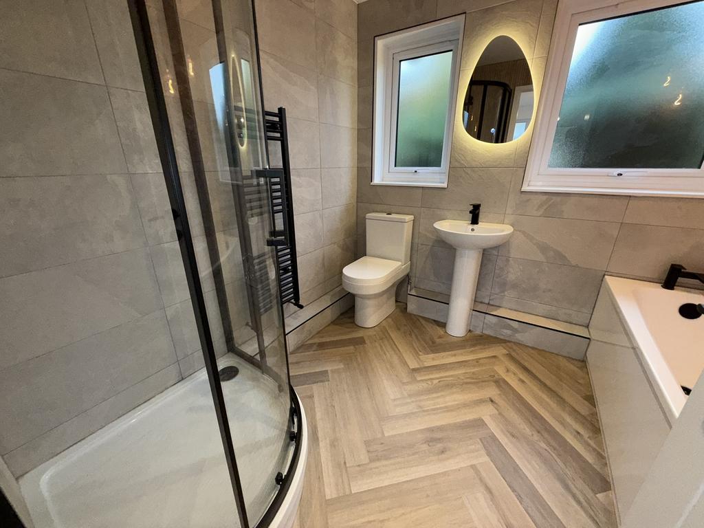 Again, a recently installed and modern suite comprising of two-double glazed windows to rear, corner glazed shower cubical with shower head and rain head, Modern ladder style radiator, low level flush WC, pedestal wash hand basin, panelled bath with feature lighting over and split face quartz tiling to one wall, LVT flooring and fully tiled walls.