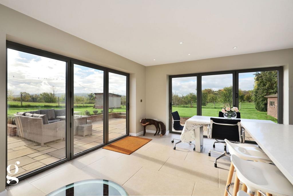 The newly extended kitchen/breakfast room forms the heart of the home. Generous in scale at approximately 6.65m x 5.80m, it enjoys a triple aspect with two sets of trifold doors and additional windows, flooding the room with natural light and showcasing outstanding views across the gardens, orchards and surrounding hills.