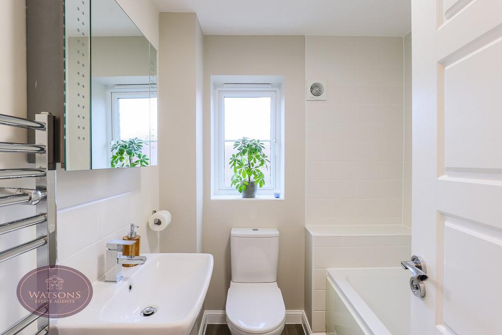 3 piece suite in white comprising WC, wall mounted sink and bath with electric shower over. Obscured uPVC double glazed window to the side, radiator and extractor fan.