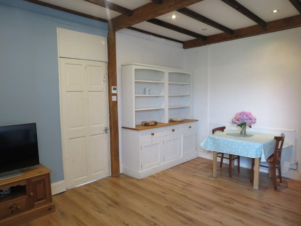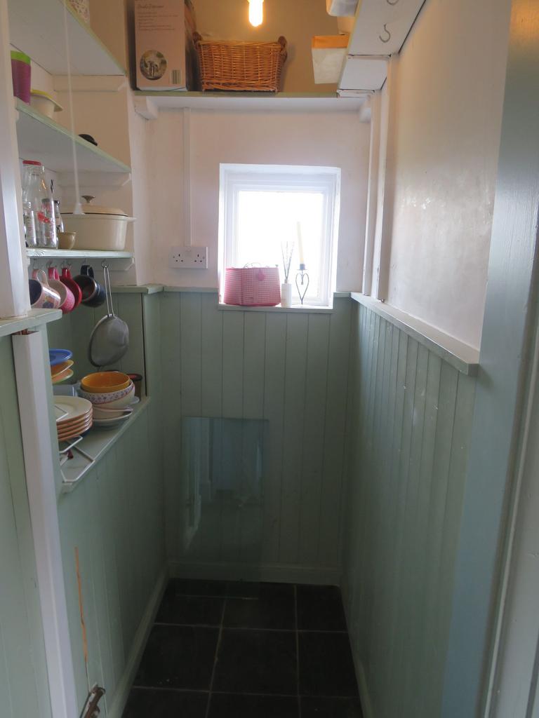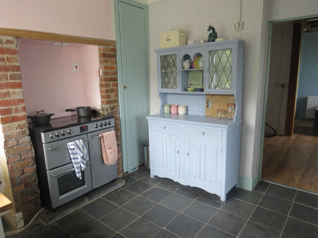 UPVC double-glazed window and part-glazed door to the side. Part-exposed brick walls. Shaker-style base units with hardwood worktops incorporating a stainless steel single bowl and drainer sink.