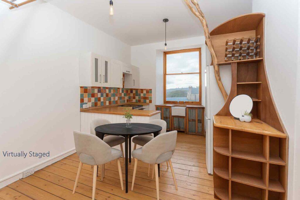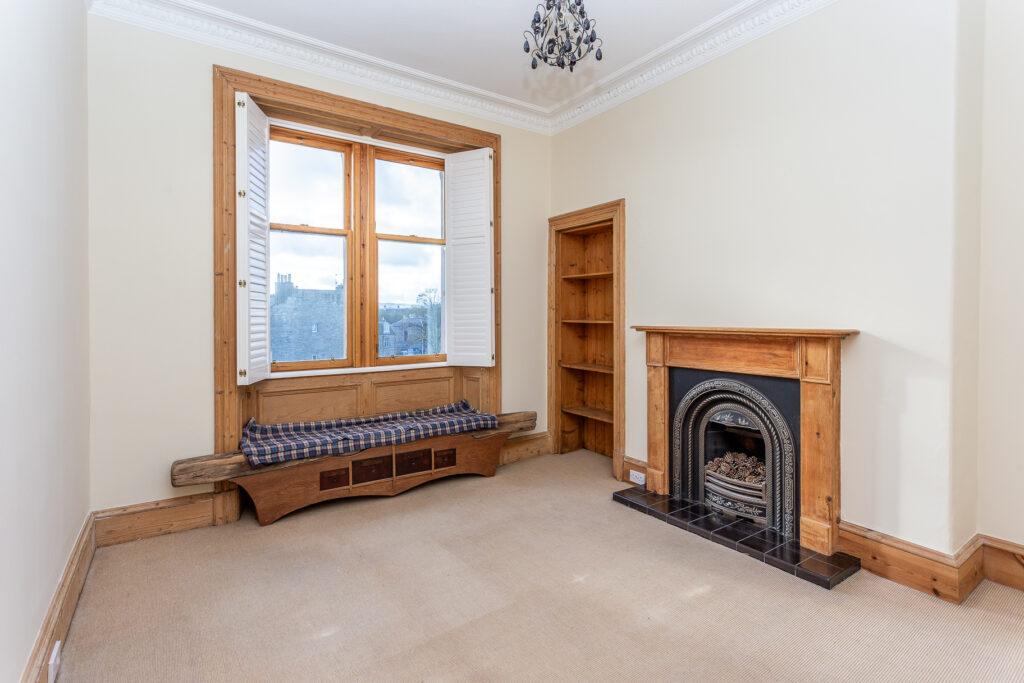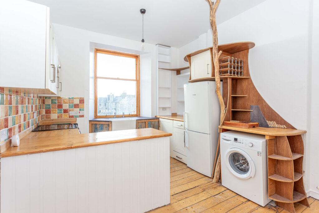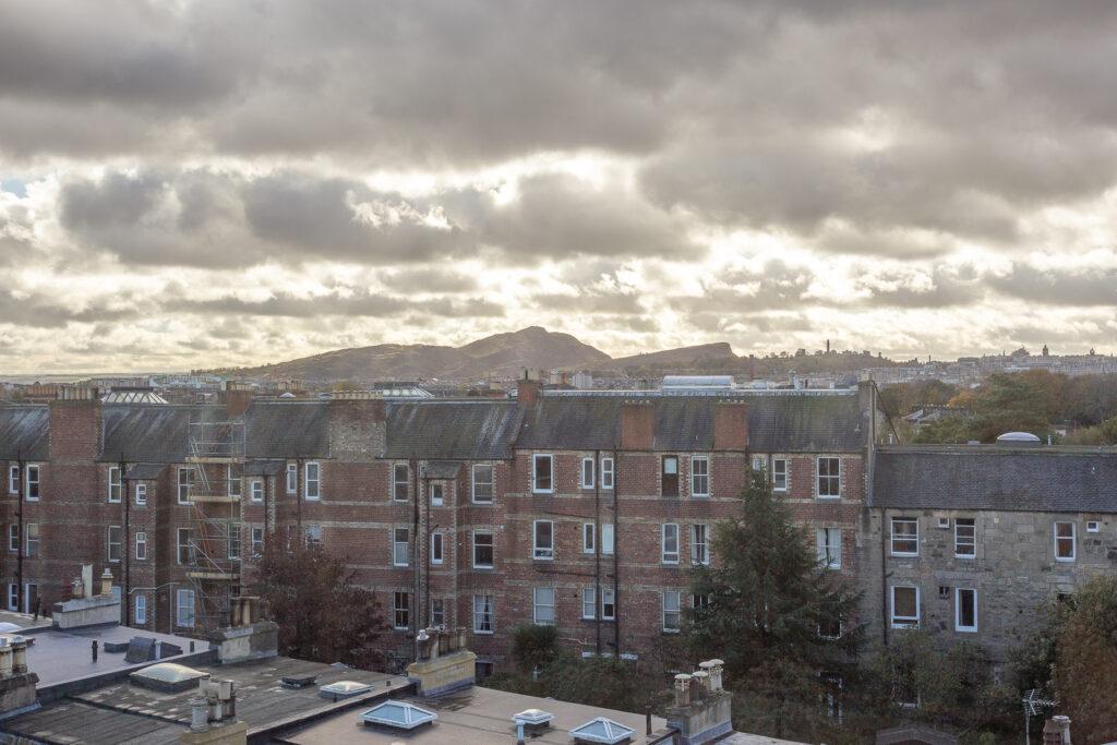 Superb, 4th floor flat with stunning views South across the City Skyline to Arthur's Seat and Salisbury Crags, St James Quarter and Edinburgh Castle. The flexible accommodation comprises an L-shaped entrance hall with skylight and large storage cupboard, bright & spacious sitting room with feature fireplace, southerly views, feature window seat and modern working shutters, there is a useful box room off the sitting room with shelving and hanging rails which could be a superb walk in dressing room, spacious dining kitchen (or kitchen / sitting room) with feature Belfast sink in custom unit, using locally sourced materials and feature shelving unit, sanded floors and ample space for dining table, double bedroom with modern working shutters, and bathroom with white suite and thermostatic shower over the bath. The flat benefits from gas central heating, double glazing, security entry phone and a communal garden. Overall, this is a fabulous first-time buyer flat which must be viewed to be fully appreciated.