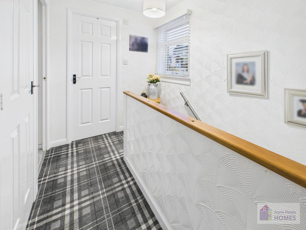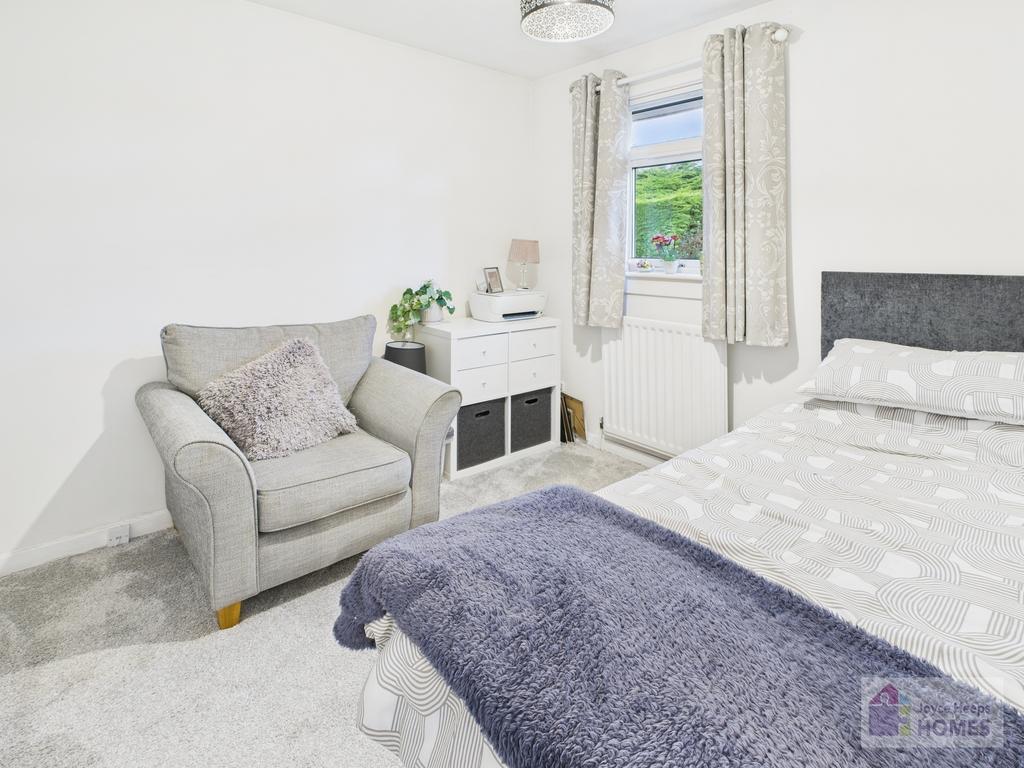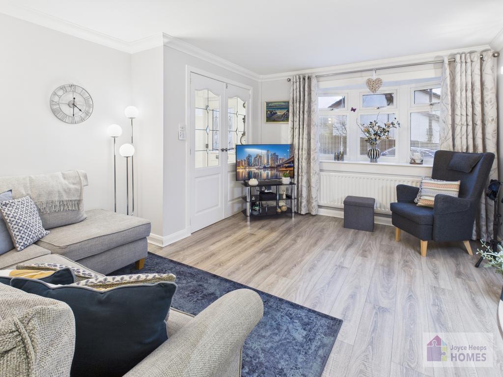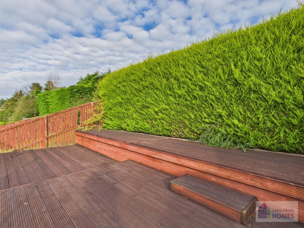 The front garden is laid to lawn with driveway to the side leading to the rear garden. The low maintenance rear garden has a concrete slab patio area, loose chips, a raised timber decked area with balustrade and is surrounded by timber perimeter fencing.
