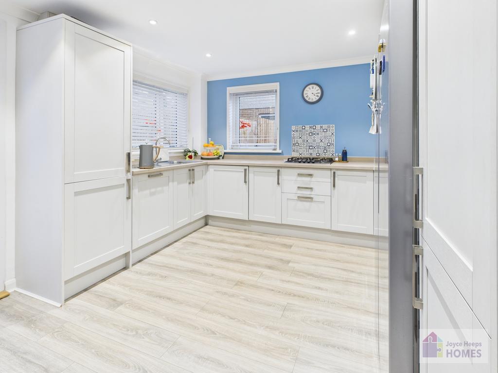 The very well-equipped kitchen is approximately 1 year old overlooks and leads through French doors to the rear garden. It has shaker style cabinets and includes the integrated double oven, gas hob, and American style fridge freezer.